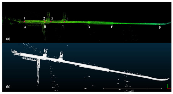 Figure 17a, which can clearly distinguish objects such as mining lamps, anchor rods, drill holes, tracks, and stone pillars. It can be seen that the laser point cloud modeling accuracy is very high in the A–D section due to the feature-rich conditions and UWB signal coverage. In the long straight roadway (C–D, E–F) with fewer features, the point cloud can also be mapped relatively accurately with no deviation and no distortion.