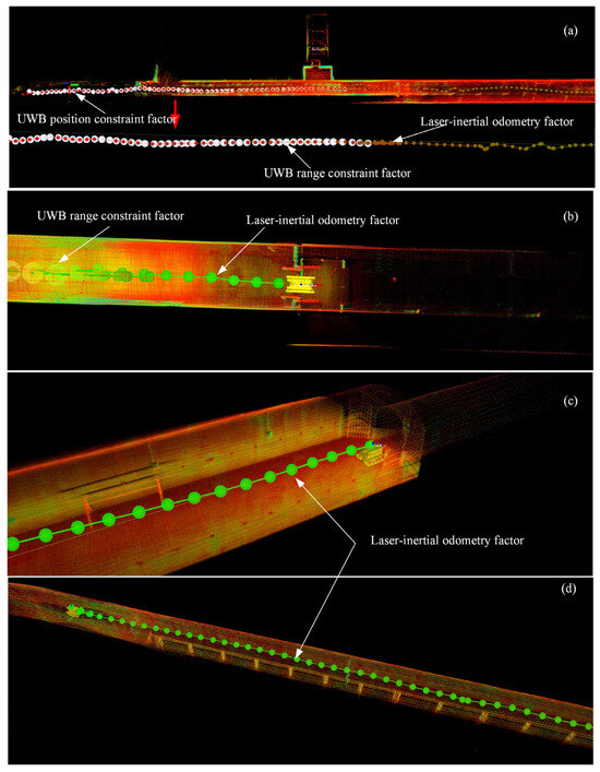 Figure 22 shows the effect of UWB position constraints and distance constraints during the map-building process, demonstrating the constraints of the UWB position and distance constraints on the state estimation process. The white spheres represent UWB position or distance observations. When the robot is in the vicinity of the UWB localization system, the UWB position estimation accuracy is high, so the UWB position observation constraints are used to participate in the optimization, and at the same time, the lidar-inertial odometry coordinate system is quickly realized to be aligned with the UWB localization system coordinate system. When the robot continues to advance across the UWB positioning system beyond a set threshold distance, the coordinate system alignment process ends and UWB distance observations are involved in the optimization for state estimation until there is no UWB distance signal at all due to occlusion. Subsequently, the robot continues to utilize the lidar-inertial odometry for position estimation. The green spheres in the figure show the keyframes created when only the lidar-inertial odometry is utilized for position estimation. With the UWB position and distance constraints, the plug-and-play customized deployment of UWB sensors based on environmental conditions can assist in mitigating the degradation of lidar-inertial odometry and the effective conduction of geographic coordinates.