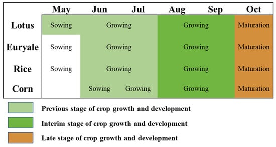 Figure 3 shows the primary crops’ (euryale, rice, and lotus) growth and development stages. Although both lotus and euryale are members of the family Nymphaeaceae and develop similarly, they require distinct planting times and techniques. While lotus seeds may be planted outdoors in May, euryale seeds need to be started in a greenhouse or hotbed and given 30 to 40 days of growth before being put in paddy fields. Rice, like euryale, is raised from seed and transferred to a paddy field 20 to 30 days later, around the middle of May. Since rice and euryale seedling development is difficult to see because it occurs outside subsidence water areas, these two crops are monitored, starting in June. The primary crop grown in the study area throughout the summer is corn, which is typically sown at the end of May or the beginning of June and gradually develops from September to October.