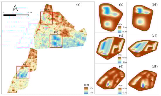Part (a) represents the elevation of the mining area corrected using MSPS predictions. Parts (b–d), respectively, show elevation maps of rice, euryale, and lotus with contour lines. Parts (b1–d1) represent 3D cross-sectional profiles of rice, euryale, and lotus, with the blue areas indicating subsided basins.