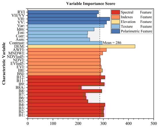 The selection of feature variables is a crucial step in remote sensing classification. Combining various feature variables can effectively improve the accuracy of remote sensing classification. However, an excessive number of feature variables can reduce the accuracy of classification results. Therefore, it is necessary to filter the features before classification. In this study, the RF classifier is used to assess the importance of features through the Gini Coefficient, which facilitates feature selection. The importance score values from 10 iterations of classification are collected and averaged. Features with score values below the average are excluded from the classification.