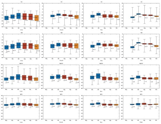 RVI mainly captures the volume scattering of plants and is more representative of the early growth and development of crops relative to the other three polarimetric features. As shown in Figure 8, the RVI box plot curve demonstrates that during the early growth stages, RVI values continuously increase and reach their peak in July, with lotus reaching its peak value at 2.483 and an average growth rate of 3.5%, euryale reaching its peak value at 2.590 with an average growth rate of 2.3%, rice achieving its peak value at 2.595 with an average growth rate of 4.2%, and corn reaching its peak value at 2.535 with an average growth rate of 4.0%.