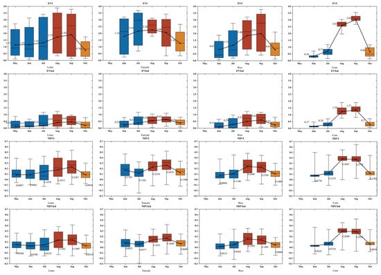 Following the growth process method mainly adopts the average VI time series curve change in the current year for analysis []. This approach does not take into account the impact of the crop itself, and instead acts on the vegetation-specific spectral features. In this study, an index box plot has been added on this basis to enrich growth information and compare monitoring results. A box plot is composed of the minimum value, upper and lower quartiles, and median. The box, which is the region between the two quartiles, represents 50% of the data. The length of the box reflects the stability of the data and indicates the tendency of the data to be concentrated or dispersed. A flatter box indicates that the data have less variation, meaning it is more stable.