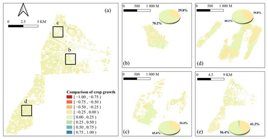 In the early growth period, the entire mining area’s comparative results for the same period (Figure 10a) fall within the range of slight decline to slight growth, i.e., [−0.25, 0.25]. The area with slight growth in vegetation covers 56.78% of the total area. From June to July 2022, 56.78% of the region showed better growth conditions compared to the average level from 2019 to 2022. Figure 10b–e represent the growth trends of rice, euryale, lotus, and corn in the early growth period from 2019 to 2022. The pie charts illustrate the proportion of each crop’s growth categories: the area with slight growth, ranked from largest to smallest, is rice (70.2%), euryale (65.6%), lotus (60.1%), and corn (56.4%).