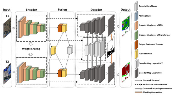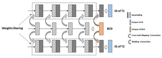 Specifically, an equal number of feature map layers in the decoder is constructed as an encoder to achieve multi-scale skip connections. Moreover, in the design of the decoder’s branches, the dual subtask branches with weight sharing for SS are set to increase the robustness of the network and reduce the calculation of parameters. With the aim of further increasing the final accuracy and fitting performance of SS branches, we adopt cross-task mapping connections that take each decoder map layer of the BCD branch and incorporate it into the corresponding map layers of SS branches, which drives SS branches to learn more abundant multi-level semantic consistency features of non-changing surfaces. Lastly, the predicted result of the BCD branch is masking connected with the final map layer of the SS branches through vector multiplication. In this study, the traditional design is followed, each decoder layer selects upsampling with bilinear interpolation, and the size of the convolution kernel is set to 1 × 1.