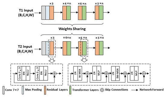 Specifically, a single backbone comprises four composite blocks as feature map layers. ResNet34 [51] serves as the standard backbone, and the first block is comprised of a convolution layer with a kernel size of 7 × 7 and a maximum pooling layer with a kernel size of 3 × 3. Next, we use two convolution layers with a 3 × 3 kernel size to form the residual connection, and the number of residual layers is set to 3. In the subsequent three blocks, we stack the Transformer layer alongside the residual layer for each map dimension. In this process, to reduce parameter computation while ensuring performance, we adopt Swin-Transformer [52] as the Transformer layer, where the window size of multi-head self-attention is set to 8 × 8.