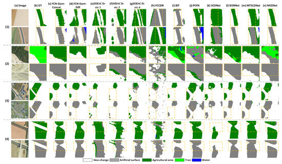 - The benchmark architectures of CD networks are: (1) The series of Siamese FCN [23]: The Siamese FCN serves as the baseline network for BCD. In this study, the applicability of Siamese FCN in SCD was investigated by only modifying its architecture at the output layers. Specifically, we adopted the fully convolutional Siamese concatenation network (FC-Siam-Conc) and the fully convolutional Siamese difference network (FC-Siam-Diff) that have been extensively employed in existing research. (2) The series of HRSCD networks [22]: baseline networks and different architectural design strategies for SCD were proposed by Daudt et al. It provides a basic reference for evaluating the proposed network. In this study, we selected three networks designed according to multi-task strategies, including the multi-task direct comparison strategy (HRSCD-str.1), the multi-task separate strategy (HRSCD-str.3), and the multi-task integrate strategy (HRSCD-str.4);