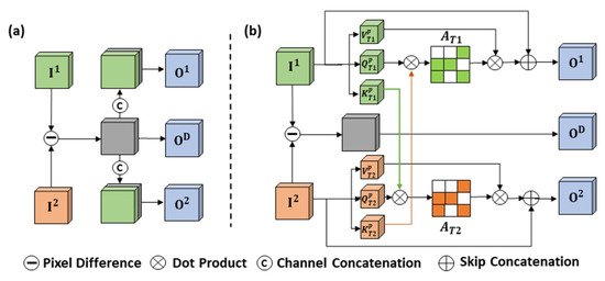 Moreover, feature fusion serves as a pivotal step for networks to obtain deep change information, and it takes on critical significance in measuring pixel similarity in bi-temporal HR images. However, in practice, bi-temporal HR images generally produce spectral reflection discrepancies for the same surfaces in one location due to differences in sensor categories or solar angle. Such discrepancies in intraclass differences can easily result in an incomplete or erroneous detection process [36]. The existing fusion methods of SCD are mostly derived from BCD, and the commonly used methods are bi-temporal pixel difference (Figure 1a), bi-temporal dot product (Figure 1b), and bi-temporal channel concatenation (Figure 1c). With the advancement of research, there have been some achievements in exploring fusion methods for SCD. Zheng et al. [37] proposed a temporal-symmetric transformer module for SCD to enhance the temporal and spatial-symmetric interaction of features. Zhou et al. [38] constructed a graph interaction module based on self-attention to establish bi-temporal semantic association. He et al. [39] introduced a temporal refinement detection module to enhance the sensitivity of identifying change for networks. However, in the overall fusion design of multi-task SCD, the above-described methods are overly dependent on deep change feature modeling while neglecting the feature connection of non-changing on SS branches. Ding et al. [40] improved the learning of semantic consistency, enhanced the features in non-changing regions based on the principle of self-attention, and introduced a cross-temporal semantic reasoning (Cot-SR) module. However, through the reverse interaction of the feature vector between SS branches, each branch’s attention map still covers semantic information from different regions, which may trigger redundancy or interference of deep features for the opposite SS branch. Accordingly, it is imperative to develop an efficient feature fusion method for SCD to increase the semantic consistency of surfaces that belong to the same class.