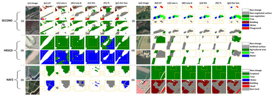 Comparing SCL and TL, it can be observed that the predicted results of SCL are superior to those of TL. Additionally, TL fails to achieve the results of Loss-a on the HRSCD and NAFZ datasets (only achieve 28.72% and 33.09% in Score, respectively). This situation can be attributed to differences in the measurement approach of the loss function, resulting in issues of applicability across different datasets. And the joint loss function we design in this study gains significant improvements across the metrics, which achieves optimal performance. In the visualization results of Figure 14, we can clearly see that the proposed loss can effectively handle the change surface that is difficult to identify, while also achieving a higher level of granularity in SS, especially in the detection of water. The proposed joint loss function demonstrates excellent recognition performance (e.g., (2), (3), and (5) in Figure 14). From the results of various loss functions, we can find that the intrinsic connection perspective of the joint loss function, SS and BCD, complements each other and optimizes together. As BCD undergoes optimization improvements, SS can concurrently gain enhancements [39,60].