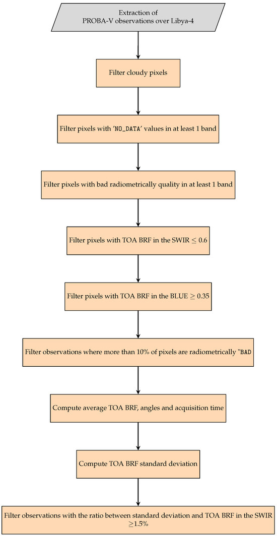 The current study relies on harmonization using a common vicarious radiometric calibration reference, consisting of simulated reflectance over a bright desert pseudo-invariant calibration target (PICS). Libya-4 centered on (23.39°E, 28.55°N) in the Great Sand Sea has been chosen for that purpose. It is a location composed of spatially organized sand dunes. Govaerts [16] has analyzed the impact of the site size as a function of the surface reflectance standard deviation, showing that a size of 50 km exhibits the lowest value. To perform this harmonization, clear-sky TOA BRF observations from VEGETATION-1, -2, and PROBA-V acquired over this PICS have been extracted in a 50 km × 50 km area applying successive filtering, explained in Figure 2. Each of these steps is performed to obtain time series free of any cloud contamination, poor radiometric performances, or characterized by extreme aerosol events (e.g., thick dust storms).