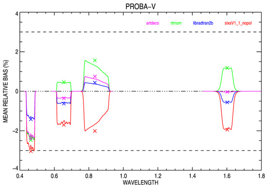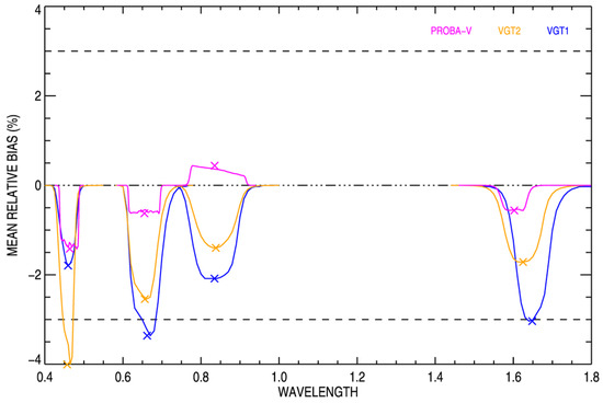 An example of the mean relative bias estimated with each radiative transfer model is shown in Figure 3. The difference obtained with each model is explained in Govaerts et al. [19]. The mean relative bias obtained with the Libradtran model [20] for VGT1, VGT2, and PROBA-V (all cameras) is shown in Figure 4. The overall harmonization results are shown in Table 1. The value of these coefficients is usually lower than the accuracy of our calibration reference, demonstrating that most of the bands are very well calibrated. The relevant aspect of these results is the harmonization of the time series against a common calibration reference, not the exact accuracy value of the calibration reference. There are, however, few exceptions in the blue bands where the harmonization coefficients exceed 3%. These coefficients are applied to the TOA BRF values that are extracted from the MEP archive before being ingested by the CISAR algorithm.