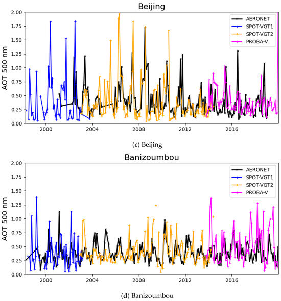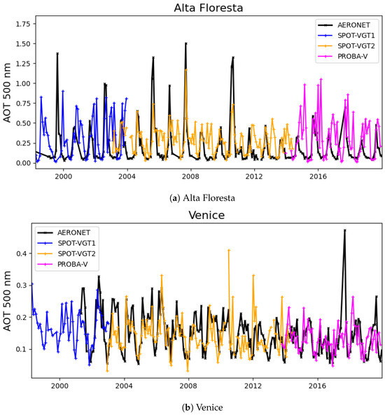 Table 3 shows the number of points, correlation, and APU statistics against the AERONET dataset over the four key areas listed in Table 2. Figure 5 shows the time series of the AOT retrieved by CISAR from VGT1, VGT2, and PROBA-V observations and the same quantity provided by the AERONET dataset over the four selected areas. For visual clarity purposes, the geometric monthly mean is shown. It should be noted here that PROBA-V Collection 1 data have been used in this exercise, which was the only release available during the execution of this project. However, one year of Collection 2 data, delivered preliminary by VITO, has been processed with the CISAR algorithm to assess the impact of this new collection. By comparing the performances against AERONET for both the retrieval from Collection 1 and Collection 2, it is found that the APU statistics associated with the CISAR retrieval improve by 34% on average. These improvements result, among others, from the improved cloud detection algorithm and radiometric characterization of the instrument, described in [30]. Collection 2 improved cloud masking algorithm reduces the cloud contamination, leading to high values of AOTs, such as the high value in Figure 5a. Similarly, the SPOT-VGT system is known to have a deficient cloud screening algorithm due to missing information in the thermal infrared part of the spectrum ([31,32]). The sub-optimal cloud masking in the satellite observation leads to large contamination in the retrieved AOT; large peaks can in fact be observed in Figure 5a far from the biomass burning events identified in the AERONET dataset. Residual overestimation of the aerosol load, probably due to cloud contamination, can be observed in all datasets retrieved with the CISAR algorithm. Despite the cloud masking limitations, related to the lack of a thermal infrared band, the retrieval from the three sensors with the CISAR algorithm is continuous over Alta Floresta and Venice. Over Banizoumbou and Beijing, the differences among the sensors become larger, especially at low AOTs (e.g., over Banizoumbou between 2004 and 2006). The latter is an arid area with dust aerosol particles and an extremely polluted urban area, respectively. In the former case, the contrast between surface and aerosols is reduced; in urban areas, the aerosol retrieval is complicated by the surface heterogeneity and the spatial distribution of the aerosols. As the information content associated with the AOT decreases, a non-accurate characterization of the radiometric uncertainty can lead to imbalances between the observation coming from the observation and the one coming from the prior information within the OE framework. This issue will affect mostly low AOTs, where the information content is reduced due to the limited contribution of the aerosols to the signal.