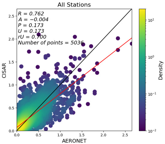 Evaluation of CISAR AOT at 0.55 μm (y axis) against AERONET V3 L2.0 (x axis) over all selected stations. The solid red line represents the regression line.