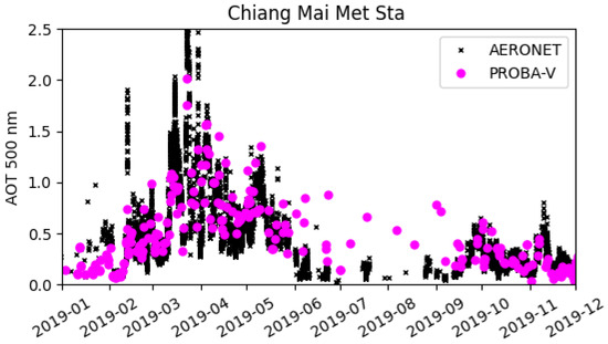 The overall evaluation of all available AERONET stations is shown in the scatterplot in Figure 7. Some overestimation at low AOT can be observed; the latter could originate from residual cloud contamination or could be explained by highly local aerosol events where the coarser spatial resolution from satellite observations could lead to a higher observed AOT compared to a ground-based measurement such as AERONET. Compared to the previous application of the CISAR algorithm to PROBA-V observations, performances are largely improved: the correlation is increased by a factor of 1.6, and the systematic underestimation at high values of AOT is reduced [8]. In fact, Figure 7 shows CISAR’s capabilities of retrieving high values of AOT (larger than 2.0). This feature can be observed, for instance, over highly polluted targets (Chiang Mai, Thailand) or during biomass burning events (Misamfu, Zambia). Figure 8 and Figure 9 show the high AOT values due to the high pollution over Chiang Mai as well as the larger number of fires in March [35] and the beginning of the biomass burning season over Misamfu in July/August. The seasonal occurrence of biomass burning in this region and the CISAR capability of detecting this phenomenon will also be analyzed in Section 3.2.2. Over Chiang Mai, the availability of AERONET observations strongly decreased after June 2019 (Figure 8). This might suggest the presence of clouds, as AERONET is only available in clear-sky conditions. Similarly, the CISAR algorithm shows fewer data points, meaning that either no aerosol retrieval was performed due to the presence of thick clouds, or the QI associated with CISAR retrieval is lower than 0.2 (and therefore filtered from this analysis). In particular, CISAR and AERONET measurements are not always collocated between June and September (e.g., early July and early August). Finally, in the hypothesis of cloud presence, it should also be kept in mind that CISAR retrieval is performed at 5 km spatial resolutions, and therefore effects such as the AOT enhancement due to aerosol swelling in the vicinity of clouds might impact the measurement, compared to a columnar ground-based measurement such as AERONET. Despite the differences observed over Chiang Mai after June, the ability of CISAR to correctly retrieve the temporal evolution of aerosols extends to low values of AOT as well, as it can be observed in Figure 9 during May and June, where CISAR shows a very good temporal agreement with the AERONET database, despite the small magnitude of the measured AOT (lower than 0.2).
