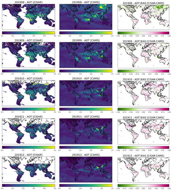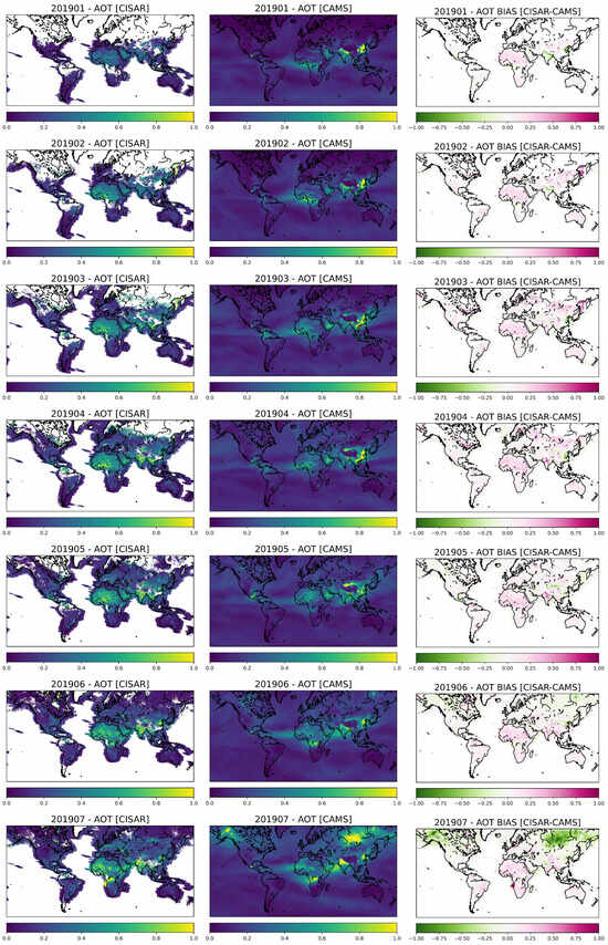Monthly aggregated Level-3 products are obtained from Level-2 products by averaging the retrieval in a 1-month time window. The average is weighted by the QI to maximize the quality of the retrieval. Level-3 products offer an additional tool to assess CISAR’s capability to detect seasonal trends. CISAR’s performances in retrieving correctly the AOT magnitude, temporal evolution, and spatial consistency are here evaluated against the CAMS reanalysis data [18]. Figure 10 shows the AOT at 550 nm monthly averages obtained from CISAR retrieval (left column), the CAMS dataset (mid-column), and the difference between the two products (right column).