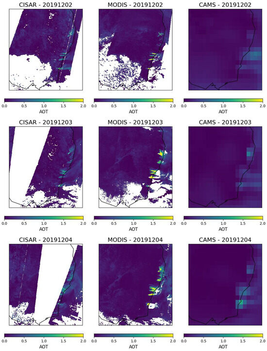 During the 2019–2020 bushfire season in Australia, also called the Black Summer, more than 60 million acres were burned. From September 2019 to March 2020, fires heavily impacted various regions of the state of New South Wales. These bushfires have been observed by several remote sensing instruments, including PROBA-V. The CISAR algorithm applied to PROBA-V correctly identifies the high AOT values originating on the land and propagating towards the sea. Figure 11 shows the AOT retrieval obtained from CISAR applied to PROBA-V (left column), MAIAC applied to MODIS (mid-column), and the CAMS datasets (right column). The MAIAC algorithm shares some similarities with the CISAR algorithm, as it relies on the assumption of slow temporal variation of the surface reflectance to retrieve the surface bidirectional reflectance distribution function (BRDF) and discriminate the contribution of the atmosphere. It should be noted that CISAR retrieval is performed at a spatial resolution of 5 km, while MAIAC is applied to 1 km resolution data, and CAMS is provided at 40 km. Both the retrieval obtained from CISAR applied to PROBA-V and from MAIAC applied to MODIS detect the high aerosol load between 2 December and 4 December 2019; however, MODIS retrieves a larger AOT. Nevertheless, the CAMS dataset over the same area does not show values larger than 1.5. Without ground observations close to the fire location, the true AOT cannot be established, and satellite-based measurements can only be qualitatively cross-validated. Despite the difference in retrieving the magnitude of the aerosol load associated with the bushfires, CISAR and MAIAC show very good spatial agreement over the observed region. It is worth noticing that MAIAC often does not retrieve the smoke over water, probably due to the latter being misclassified as a cloud, while CISAR shows a very nice continuity between land and water, showing the smoke’s spatial distribution over water.