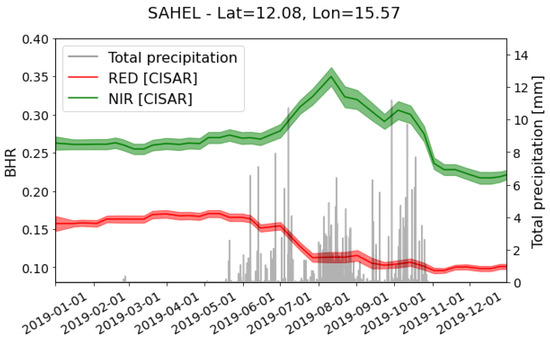 BHR retrieved by the CISAR algorithm from PROBA-V observations over one pixel, chosen randomly in the Sahel region. The shaded black lines represent the total precipitation obtained from the ERA5 reanalysis data at an hourly resolution (in mm) [24]. The colored solid lines represent CISAR retrieval, while the shaded area represents the associated uncertainty.