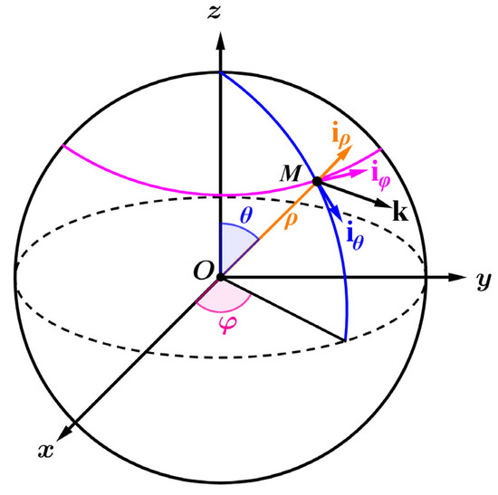 where ρ is the distance between the origin O of the geocentric reference system and the point M (see Figure 1); θ and φ are the colatitude and the longitude in spherical polar coordinates, respectively; kρ, kθ, and kφ are the components of the wave vector k orthogonal to the wave front in the ρ, θ, and φ direction, respectively; H is the Hamiltonian, P = c·t is the group path length, being c the speed of an electromagnetic wave in the vacuum, and t the group time delay; ω = 2πf is the angular wave frequency, being f the wave frequency.