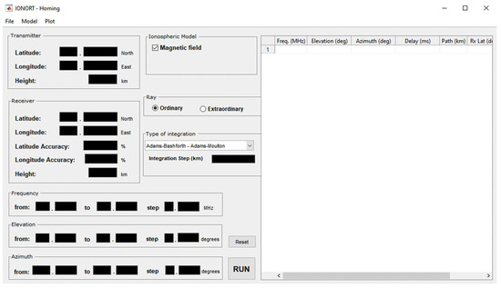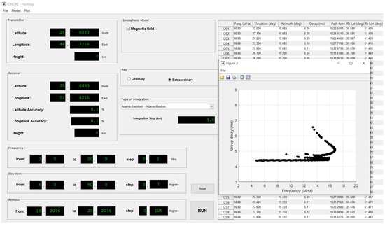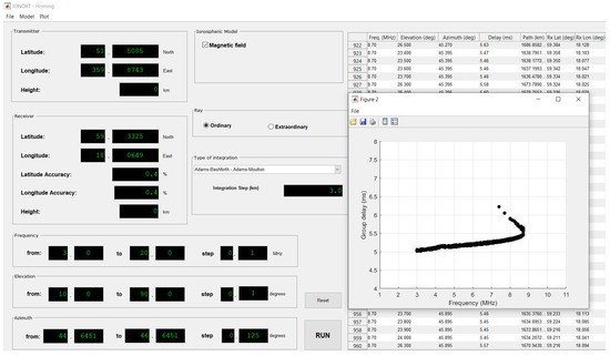 Another novelty is the inclusion of a homing GUI (Figure 6), which allows visualizing a synthetic oblique ionogram for whatever radio link the user wants to simulate on the terrestrial surface. As for the ray tracing GUI, the user can insert the loop cycles in frequency, elevation angle, and azimuth angles, and choose the kind of ray to be processed (ordinary or extraordinary), the type of integration and the corresponding step, and whether the run has to be carried out with or without the geomagnetic field. The right side of the GUI shows the list of the “winner triplets”, while the frequencies and group time delays values are automatically plotted to visualize the corresponding synthetic oblique ionogram. The winner triplets are the values of frequency, elevation, and azimuth angle, embedded in the loop cycles, thanks to which the electromagnetic wave sent out from the Tx reaches the Rx, on the basis of the chosen accuracy values. On the left side, the user, besides inserting the coordinates of both the transmitting and receiving points, can also insert the accuracy values requested along the directions north–south and east–west. It is worth saying a few words about the meaning of parameters Latitude Accuracy and Longitude Accuracy, which are chosen for running the homing procedure, because they are fundamental for the verification of the homing. The values Latitude Accuracy and Longitude Accuracy are those for which it is requested that the following logical conditions are fulfilled: