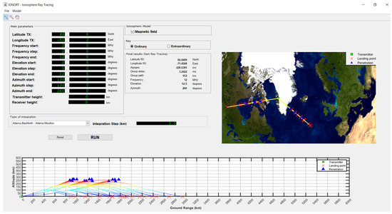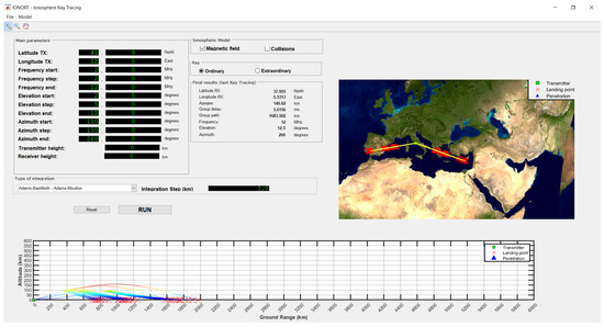 A new version of the ray tracing GUI was developed (Figure 5), that gives the user the possibility to select nested loop cycles and visualize the ray tracing results, whatever is the transmitting point chosen on the Earth’s surface. On the left side, the user has the possibility to insert the coordinates of the transmitting point and the desired loop cycles in frequency, elevation, and azimuth angles, as well as to choose the integration algorithm. In the central part, the user can include the geomagnetic field and choose both the kind of ray (ordinary or extraordinary) and the integration step. The results of the ray tracing are shown both in the lower part of the GUI as an altitude vs. ground range plot, and in the right side of the GUI as rays on the Earth’s surface.