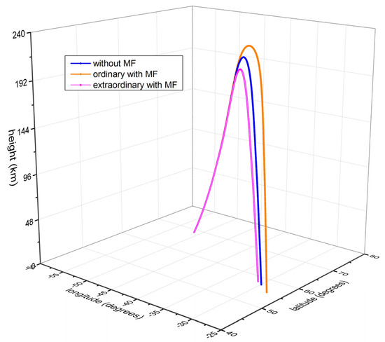 As carried out for the previous epoch, also in this case the same settings used to obtain the results shown in Figure 9 for the O mode of propagation, were used to run IONORT for both the X propagation mode and without including the geomagnetic field. An example of the obtained ray paths calculated for the O and X modes, as well as in absence of the geomagnetic field, are shown in Figure 10 for f = 2 MHz, ∆ = 2.5 °, and α = 260°.