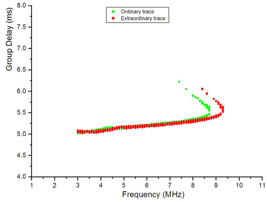 where λRx and φRx are the latitude and longitude of the receiver, while λLandingPoint and φLandingPoint are the latitude and longitude of the landing point. Whenever the condition (10) is fulfilled, the homing subroutine assumes that the position of the landing point can be approximated with the position of the receiver. In this case, the homing is considered successful. When this circumstance is verified for a given “triplet” (f, α, ∆), then a point, whose coordinates are the frequency and the time delay, is drawn so as to obtain at the end of the nested loop cycle a synthetic oblique ionogram, as shown in Section 6.