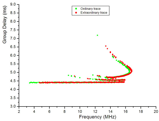 Figure 15 shows the homing result for the same radio link considered in Figure 14, for the X propagation mode. The corresponding oblique ionogram shows a lower trace related to the F1-layer, characterized by a MUF slightly larger than 16.0 MHz, and an upper trace, related to the F2-layer, showing a MUF of 16.8 MHz.