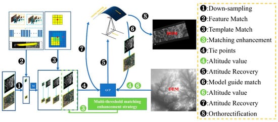 The 2OC process consists of multiple modules: a panoramic camera model, image orientation, orthorectification, and a generalized control information extraction algorithm. The detailed workflow is shown in Figure 1: First, the images are downsampled (❶), and a feature-matching algorithm is used to estimate the transformation matrix between KH-4B images and reference images (❷). Second, an image pyramid is constructed, and template matching (❸) and multi-threshold matching enhancement strategy (❸) are employed to obtain reliable match points (❹) for generating generalized control information (❹). Then, image orientation (❺) is performed, and model-guided matching (❻) is used to re-optimize the generalized control information (❻) and image orientation results (❼). Finally, the KH-4B orthorectified images are obtained using orthorectification based on iterative scanning time (❽).