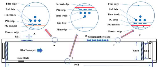 Schematic of film and PG reference data in KH-4B missions. All dimensions are in meters unless otherwise stated.