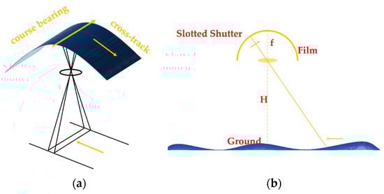 The imaging of KH-4B images. (a) The imaging process; (b) the imaging geometric relationship.