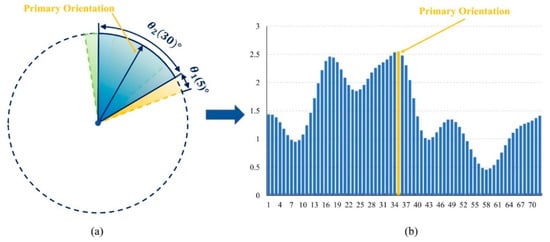Additionally, the orientation of the central axis corresponding to the sector with the second largest norm is taken as the secondary primary orientation if the value exceeds 70% of the maximum norm value. We also build a feature descriptor with the secondary primary orientation.