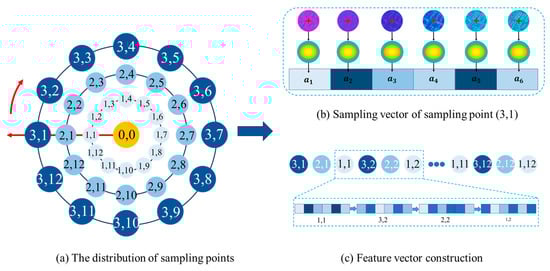 The pipeline of feature description. (a) shows sampling point distribution and numbering; (b) illustrates the construction of the sampling vector for point (3,1); (c) demonstrates feature vector construction by concatenating sampling vectors.