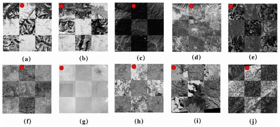 The registration checkboard of the KH-4B orthophoto and reference image with complex image contents, where the image with a red dot is the KH-4B Orthophoto. (a–c) are located at the Qinghai–Tibet Plateau, and Beijing, China, with large NID; (d,e) are located in America and Beijing with land cover change; (f,h) are both located in Burkina Faso with noises; (g) is located in Gansu province, China with few textures; (i) is located in Ethiopia with large cloud coverage; (j) is located in Chongqing, China with repetitive textures.