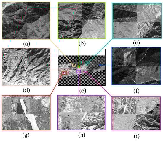 The registration results of the KH-4B image, DS1101-1069DF092c, and the reference image. (a–c) show the zoomed-in registration results of unchanged mountains; (d) shows the zoomed-in registration result of changed rivers. (e) The registration checkboard of the KH-4B orthophoto and reference image. (f) shows the zoomed-in registration result of the changed mountains area. (g,h) show the zoomed-in registration results of the changed plain area, where rivers have transformed into farmland and roads have undergone alterations. (i) shows the zoomed-in registration result of partially unchanged mountainous regions where rivers have experienced minor changes.
