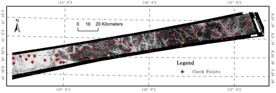 To obtain accurate ground checkpoints, sub-images were first stitched into a complete orthorectified image using the recovered georeferenced information. Then, 43 ground checkpoints were manually selected. Figure 11 shows the detailed distribution of these checkpoints. The root mean square error (RMSE) of the ground checkpoints in the X-direction is 3.89 m, and in the Y-direction is 3.29 m. The average RMSE in the X-direction is 2.69 m, and in the Y-direction is 2.52 m.