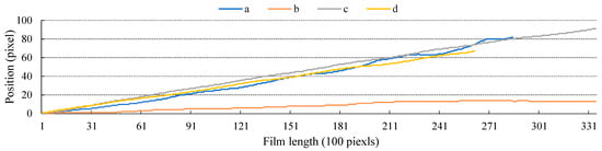 As shown in Table 8, the improvement in accuracy due to PG stripe correction for compensating image distortion is not as significant as []. Therefore, we constructed the PG stripe curves for each sub-image and found that this is mainly because the PG stripe curves of the sub-images are almost linear (as shown in Figure 12, Figure 13 and Figure 14), similar to image rotation. Hence, they can be compensated for using the angular elements of the attitude parameters. However, in the stitched complete image (with rotation and translation), as depicted in Figure 15, the PG stripe becomes more intricate. This complexity is likely due to the estimation bias in the rotation component. Consequently, PG stripe correction proves to be significant for the approach that involves image stitching followed by correction [].