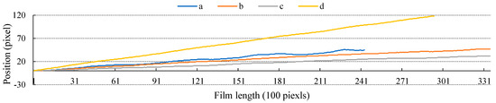 Furthermore, the rapid motion along the track direction of the camera will produce dynamic deformation in the vertical direction during the exposure process. Considering this, we employ a displacement to mitigate this deformation, which can be expressed using Equation (11).