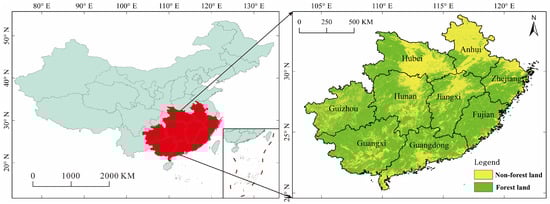 In this paper, we have selected Hunan, Hubei, Guangdong, Guangxi, Jiangxi, Fujian, Zhejiang, Anhui, and Guizhou provinces as the study area, as shown in Figure 1. The study area covers the hilly areas in the southern part of China, accounting for about 16.65% of the national land area. This area is rich in forest resources, dominated by broad-leaved evergreen forests and evergreen coniferous forests, with extensive plantations of fir, bamboo, horsetail pine, and other plantation forests []. According to statistics, the forest covers an area of 84 million hectares, with a forest coverage rate exceeding 50%, making it one of the three major forested regions in China []. Specifically, the forest coverage rate in Zhejiang, Jiangxi, Guangdong, Guangxi, and Fujian exceeds 60%, and Fujian Province has the highest forest coverage rate in the country, reaching 65.95%.