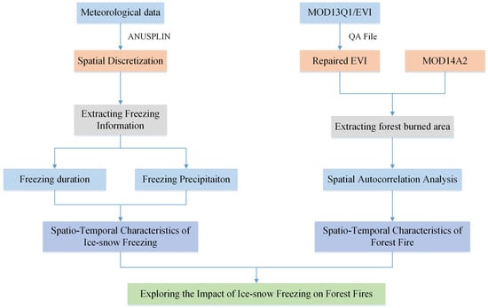 The general framework of this study can be divided into three parts (Figure 3): (1) spatio-temporal characteristics of ice–snow freezing; (2) spatio-temporal characteristics of forest fire; and (3) exploring the impact of ice–snow freezing on forest fires.