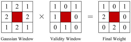 For the weight assignment of the elements within the sliding window, we used a Gaussian function to construct a Gaussian window of the same size as the sliding window. And then, the elements from the Gaussian window and validity were dot-multiplied, thereby completing the weight assignment for the valid elements within the sliding window. Considering a window of size 3 × 3 as an example, the center element in the sliding window is the target element, and no weights need to be assigned to it. In the Gaussian window, elements near the center have higher weight values than other elements, indicating spatial similarity. Thus, different elements are assigned different weight values, as is shown in Figure 5.