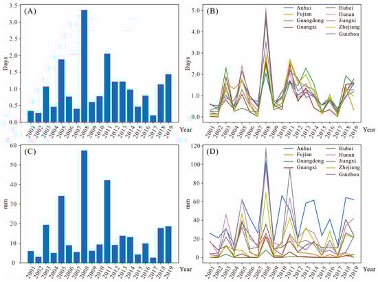 Freezing statistics for forest vegetation in each province. (A) shows the average duration of freezing for forest-covered areas in the study area; (B) shows the average duration of freezing for forest-covered areas in each province; (C) shows the average precipitation of freezing for forest-covered areas in the study area; and (D) shows the average precipitation of freezing for forest-covered areas in each province.