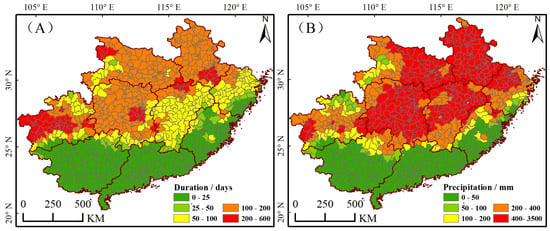 Freezing statistics for forest vegetation in each county. (A) shows the average duration of freezing for forest-covered areas in each county during 2001–2019; (B) shows the average precipitation of freezing for forest-covered areas in each county during 2001–2019.