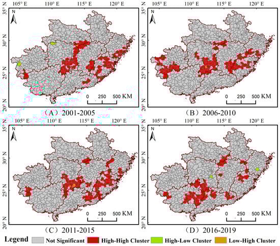 To explore the clustering pattern of forest fires in the study area at the county level, the global Moran’s I for forest fires was calculated in four time periods, 2001–2005, 2006–2010, 2011–2015, and 2016–2019. The results were 0.44, 0.50, 0.33, and 0.29, respectively, and all of them passed the p value significance test. In terms of temporal variation, the global Moran’s I showed an increasing trend from 2001 to 2010, indicating a rise in the spatial clustering of forest fires during this time period. However, during the period 2011–2019, the Moran’s I showed a decreasing trend, indicating a decrease in the spatial clustering of forest fires in the study area. This trend may be directly related to the significant reduction in the forest-damaged areas by fires after 2009.