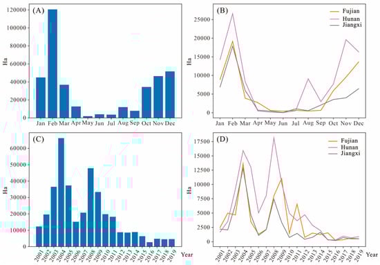 Spatial and temporal distributions of forest fires in the study area, 2001–2019. (A) shows forest-damaged areas caused by fires for the study area, categorized by month; (B) shows forest-damaged areas caused by fires for each province, categorized by month; (C) shows forest-damaged areas caused by fires for the study area, categorized by year; and (D) shows forest-damaged areas caused by fires for each province, categorized by month.
