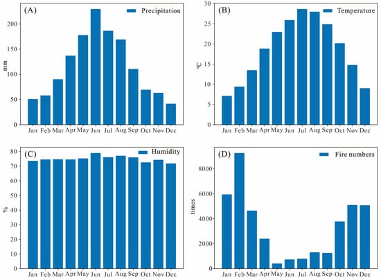 The statistics on precipitation, air temperature, relative humidity, and the number of forest fires under different time periods in subtropical China from 2001 to 2019. (A) shows precipitation categorized by month for the study area; (B) shows air temperature categorized by month for the study area; (C) shows relative humidity categorized by month for the study area; and (D) shows fire numbers categorized by month for the study area.