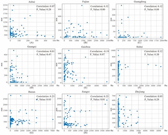 Correlation between forest fires and freezing precipitation in each province, 2001–2019. The horizontal axis represents the forest-damaged areas caused by fires in each county during the period 2001–2019; the vertical axis represents the amount of freezing precipitation for the forest-covered area in each county during the same period.