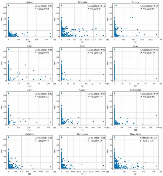 In order to explore the temporal impact of ice–snow freezing on forest fires, we regarded county as the basic unit, we assessed the freezing precipitation in Jiangxi and Hunan provinces year-by-year and the forest-damaged area caused by fire month-by-month and then calculated the correlation coefficients between the two. As shown in Figure 13, the correlation between freezing precipitation and forest fires in every month is low. Among them, correlation coefficient passes the significance test only in January, February, March, and April. Moreover, the correlation coefficients of 0.12 and 0.13 are observed for February and March, respectively, and are significantly higher than those in other months. This evidence implies that while ice–snow freezing can affect forest fires, their role is not significant. This is mainly related to the fact that forest fire is a natural disaster affected by both natural and anthropogenic factors, which are characterized by quick emergence and are influenced by many factors [,]. In addition to ice–snow freezing, high temperatures and drought in summer and storms in winter increase the possibility of forest fire occurrence by increasing the combustible load of a forest [,,]. In addition, forest fire behavior is closely related to human activities [], and cold winds in winter can increase forest-damaged areas by accelerating fire spread and increasing combustible loads []. The compounding effect of these factors may diminish the significance of the impact of ice–snow freezing on forest fires.