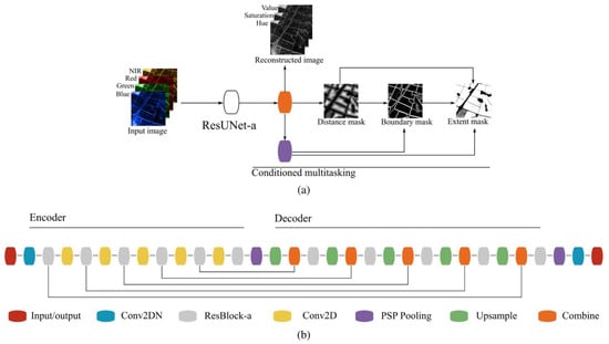 Multi-task segmentation of ResUNet-a []. The emphasis of ResUNet-a lies with the multitasking approach. Producing the three segmentation masks is the main innovation of this network in boundary delineation. (a) ResUNet-a outline: Initially, a distance mask is derived from the feature map. This mask assists in determining a boundary mask. Together, these masks predict an extent mask. Additionally, a separate branch reconstructs the initial image. (b) Design of ResUNet-a.