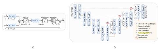 The concept of attention gating was jointly introduced in the collaborative works of Oktay et al. [] and Schlemper et al. []. They showed that U-Net, when integrated with attention gates, enhances its proficiency in attending to the essential parts of an image, thus magnifying its precision in tasks like image segmentation. Figure 2 illustrates the attention gate and its implementation within the U-Net architecture. In the realm of neural networks, the concept of “attention” mirrors the human capability to concentrate on specific details within a vast array of information. The attention gate mechanism serves this exact purpose within the U-Net architecture which was proposed by Ronneberger et al. []. Within the U-Net’s architecture, skip connections, as discussed by Wang et al. [], play an important role, transferring information from the network’s early layers directly to its later layers, ensuring the preservation of image details. However, the attention gate refines this process by allowing the network to accentuate the most important information from these skip connections. This refined information is identified through attention coefficients, values ranging between 0 and 1, which effectively spotlight significant image regions. This concept aligns with methodologies that value8 specific information channels, as seen in other works like sentence embedding in the work of Shen et al. []. The gating process, a key component of the attention gate mechanism, utilizes information from broader image scales to discern between vital and extraneous areas in these skip connections, as elaborated by Wang et al. []. This gating, similar to the attention mechanisms described by Mnih et al. [], is strategically positioned before the merging of layers, filtering activations during the forward pass and ensuring learning focused on the pivotal regions during the backward pass.