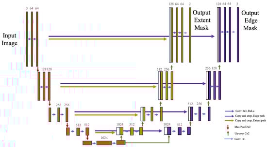 A schematic of the modified dual-headed U-Net architecture implemented in our study. In contrast to the original U-Net architecture that features a single expanding path, our design requires two expanding paths: the edge path and the extent path. These are trained concurrently, demanding the encoder to adapt and guarantee precise outputs from both paths. Despite the modification, this design maintains the contracting path identical to the original U-Net model.